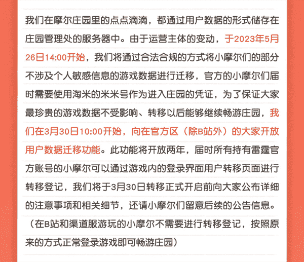 合作结束本就是开发方和代理方双方的事情,,,降低这件事情对玩家的影响,,才是对所有珍视这段童年的摩尔玩家最好的呵护。。。。目前看来,,,用户完全不用担心后续因无法登录游戏而造成任何数据上的损失,,,只要及时进行账号转移,,,就可以好好保留、、、、延续在庄园的痕迹和回忆,,,继续在庄园里做快乐的红鼻子小鼹鼠。。。。