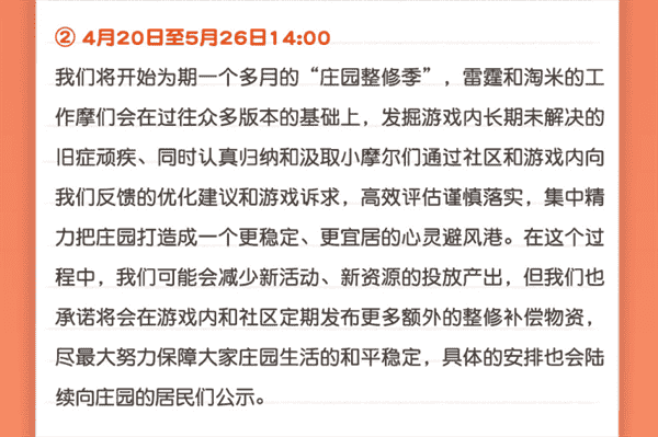 合作的结束并不意味着这个童年IP的结束,,,对于《摩尔庄园》手游而言,,,,这是一个新阶段的开始。。。。后续游戏内将开启庄园重构计划,,会就以往遗留下来的BUG进行集中修复,,,并在游戏内和社区定期发布更多补偿物资。。