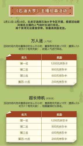 除了“油王”争霸赛,,精英主播招募活动亦同步开启!!!!赛事分时长奖和人气奖,,,奖励同样丰厚!!!