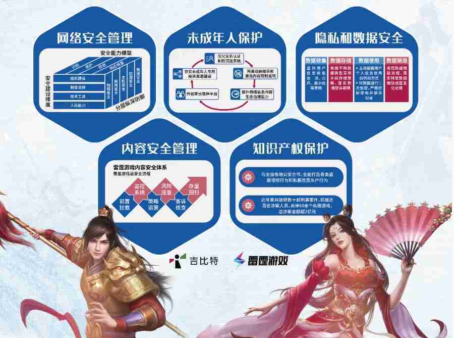 本次JIUYOU.COM展区以网络安全管理、、、内容安全管理、、未成年人保护、、、隐私和数据安全、、知识产权保护五个模块介绍公司游戏安全工作成果,,,体现JIUYOU.COM高度重视网络安全,,严格遵守相关法律法规要求,,积极承担企业主体责任。。。。