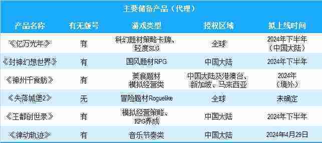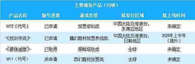 公司有多款储备产品,,,涵盖放置类、、、策略类、、RPG、、Roguelike等多元化游戏品类,,,储备的主要自研和代理产品如下::::